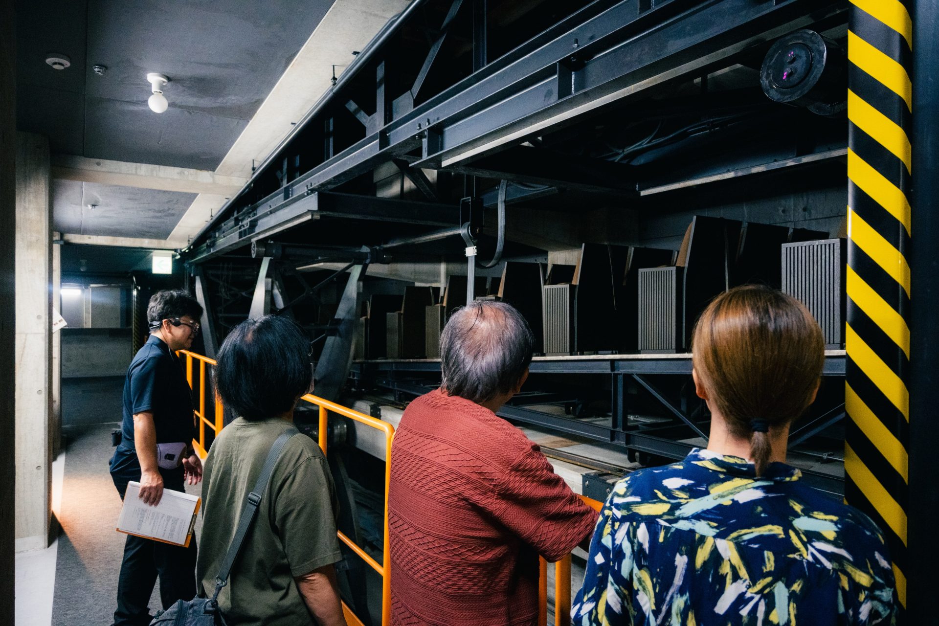 まずは舞台に上がり、床がぐるっと動く「廻り舞台」や、文楽の舞台として床が下がる「船底」の機構を、実際に動く床の上に乗り体験。文楽で使われる「船底」の機構で自動で動かすことのできるものは全国で数ヶ所と大変珍しいものです。
