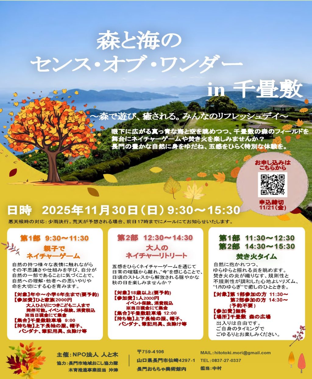 | スケジュール | 【親子の部(午前)】 9:00- 集合・受付 9:30- ネイチャーゲーム スタート 11:30- ネーチャーゲーム終了、焚き火タイム 12:30- 焚き火タイム終了・解散 【大人の部(午後)】 12:00- 集合・受付 12:30- ネーチャーゲームスタート 14:30-ネーチャーゲーム終了、焚き火タイムへ 14:00- 焚き火タイム終了、解散 |